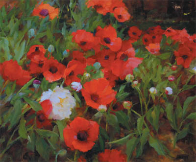 When it comes to deciding what to paint, oil painter Kathy Anderson follows the flowers. Keeping abreast of what flowers grow at certain times of the year, she shares their delicate beauty through her award-winning garden, still life, and landscape paintings. Kathy Anderson (Connecticut) Poppies And White Peonies Oil 20″