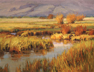 Kim Casebeer has never gotten over her love of the outdoors- and for that, art lovers are grateful. If she had, they would have been denied the opportunity to lose themselves in the beauty of the landscapes she so expertly and artistically creates. Kim Casebeer (Kansas) Reflections Oil 24″ By