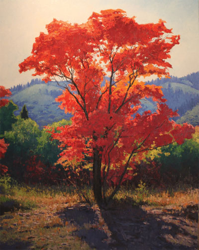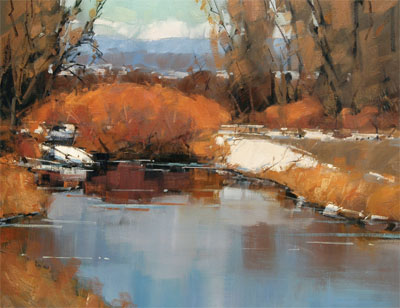 While his forte is capturing the pristine beauty of the American West in all its diversity, lakes and streams highlighted by the melding of autumn into winter are often prevalent themes in Colorado-based painter David W. Mayer’s sparkling landscapes. By combining a refined sense of color with his ability to