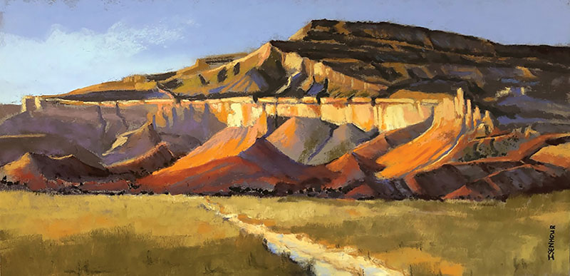 “That fetching late light—angles, layers, heavy strokes, and building strong contrast tell the story of that light. As in much of my work depicting this type of landscape, I work to simplify. To see its massive strong form from a distance is such a contrast to the understanding that it is slowly being degraded by nature. We are oblivious to its fragility while we are mesmerized by its strength. I try to convey that with strong, decisive, layered strokes.”