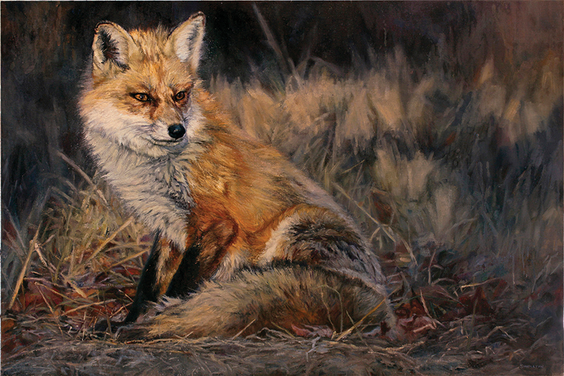 “My favorite time to get outdoors is just before sunset. Animals come out to feed, and I love the warm, golden hour light. On one such outing, just as the sun was setting, I was treated to a special red fox sighting. He emerged out of a dense thicket into the most beautiful light where he just posed and posed for me. When he figured I had enough photos, he continued on his way. I imagine he was heading out for the evening to hunt. I swear some animals just want to be painted.”