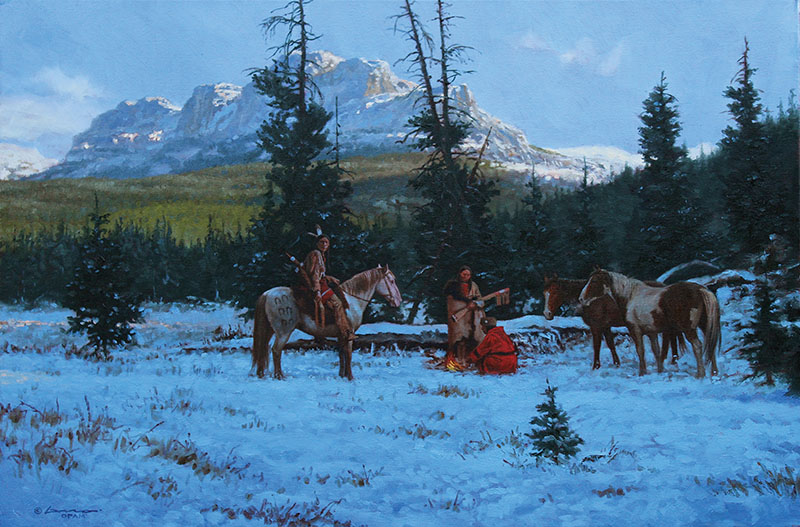 “A trio of Blackfeet are getting some early dawn warmth at a fire while on a horse raid. They remain cautious and alert while on their journey into Crow country. Winter horse raids were fraught with danger, but the chance of success was greater. If their raid is successful, they will soon be back in the safety of their camp.”