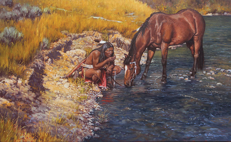 “During the Great Sioux War years, after a long day on scout, a Cheyenne stops for a drink of water while his pony drops his head to partake as well. Ever vigilant, the Indian hones his skill at the mundane with a caution born of necessity.”