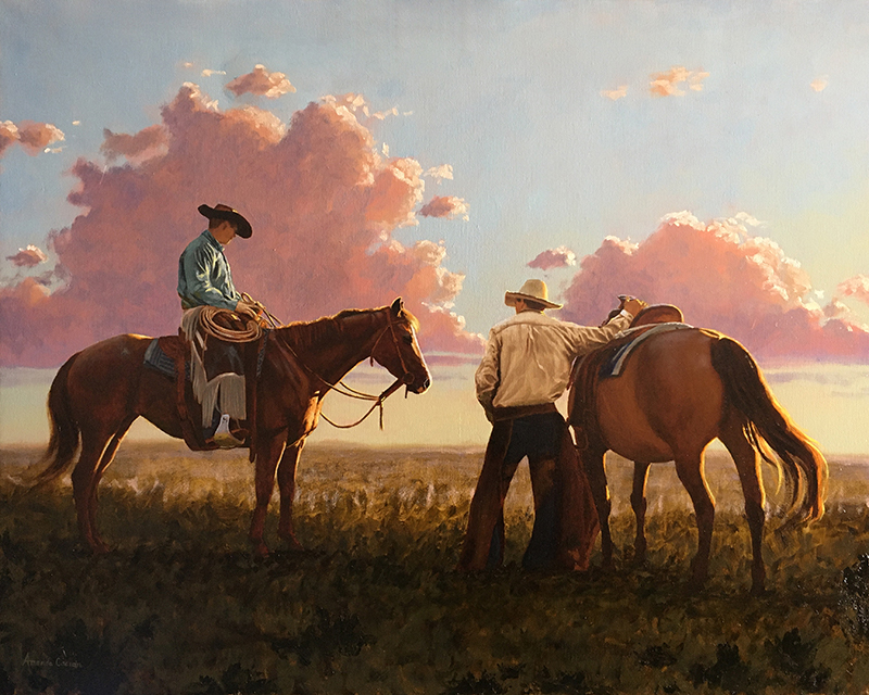 “In this painting, two cowboys meet early in the morning to plan out their day. Mornings start early and there is always more to do than daylight allows. A little bit of communication can go a long way to make the work flow smoother and prevent a lot of unnecessary stress and confusion. Efficiency is important when there is so much to try to accomplish before the day is over.”