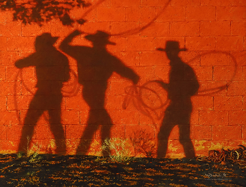 “After the day’s work, cowboys show their rope skills to each other with tricks and contests to pass the hours while the evening sun catches the activity and creates ‘shadow ropers’ on the side of the barn.”