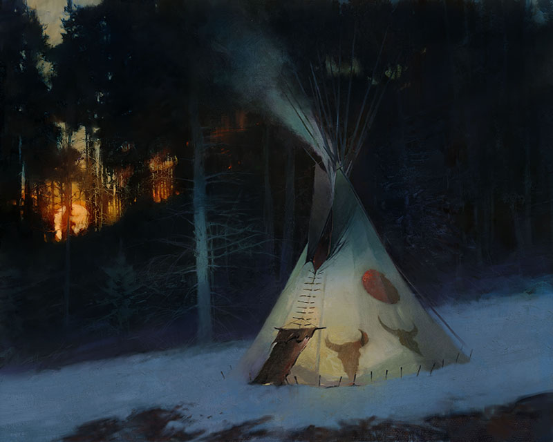 “The last warmth of a weak winter sun passes over a lone tipi in the shadows. The lodge’s design suggests the nature of the starving time: long, cold nights and little food, skeletal bison, and a ‘bad moon’ on the rise.”