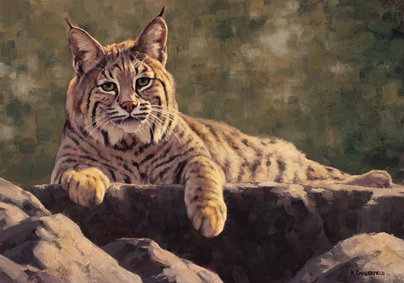 “I often paint animals that are moving or interacting, but occasionally I also like to show them in the more passive moments that make up a majority of their day. This bobcat is relaxing on a rock and is not concerned with much else going on.”