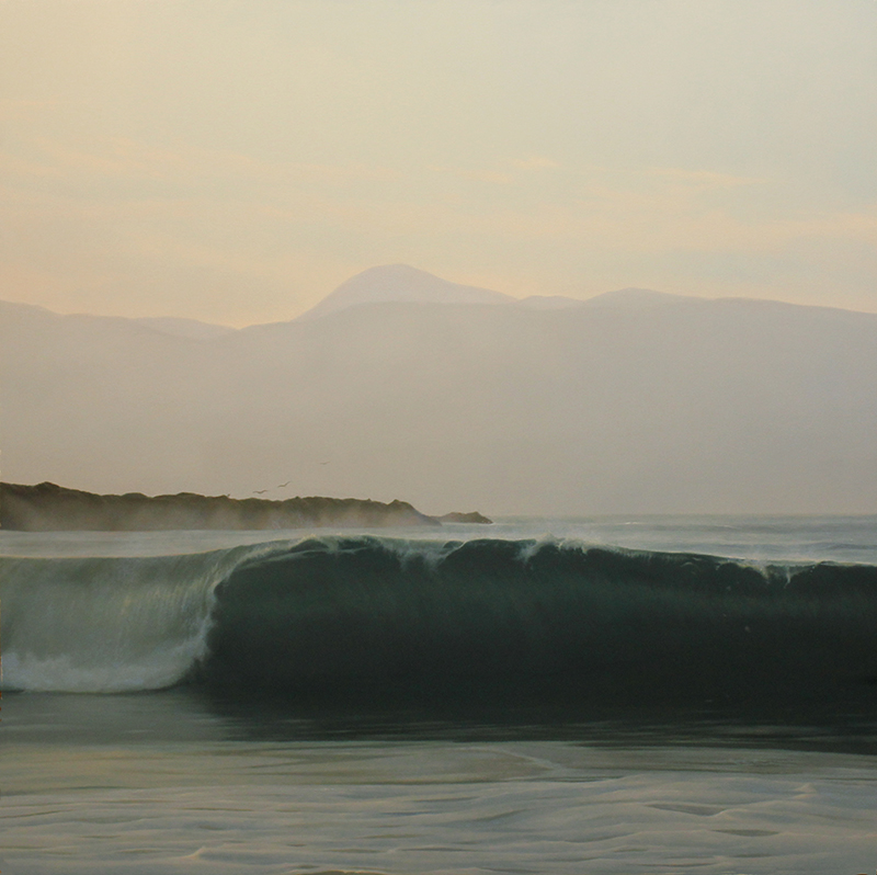 “Since I have not spent much time in California and do not know it in any detailed way, I am fully free to romanticize it. In this painting I just wanted to freeze a moment in time, an image that I thought those who ‘pulled stakes’ and packed their cars for the Pacific might have also mentally conjured. The original oil painting is very smooth and glassy, and because of that the ocean water seems extra seductive.”