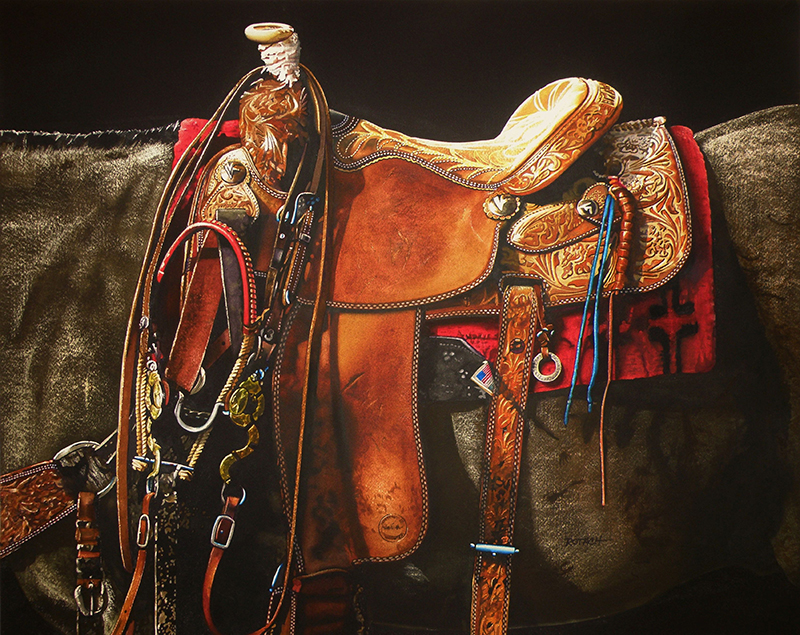 “This saddle painting displays my homage to the Baroque still life painters of the 17th century. It is a technique they developed called chiaroscuro. It focused on the drama created by strong contrasts of light and shadow. At the same time, I view this subject in terms of abstract qualities with an emphasis on diversity of shapes, colors, and textures. Like snowflakes, this subject comes in endless varieties.”