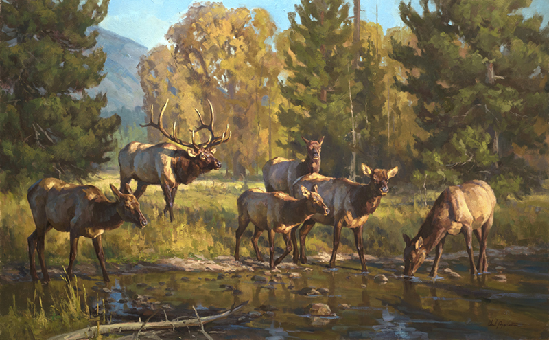 “September is the prime-time rutting season for the North American elk. Here, an amorous bull elk escorts his harem to a cool refreshing stream to quench their thirst from the hot dry days and relax before the romantic shenanigans of the evening.”