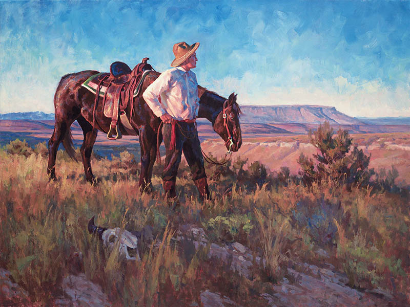 “A personal hero of mine and many other artists is C.M. Russell. He painted from memory and experience, while not having the luxuries of cameras, computers, or a well-lit studio available, to enchant us with his painted stories of the West. History owes provenance to Russell’s ardent attention to the details he painted of time and place. I can imagine Charley standing on a prairie vista, looking out across Square Butte, envisioning stories passed on to him from the old chiefs and cowboys friends, literally being caught up in the moment.”