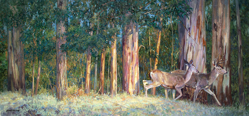 “I love the marbled, taffy-like color patterns found in eucalyptus trunks. Beautiful hues of salmon, teal, and tan intertwine, resulting in arresting color harmonies; a poetic setting for a black-tail pair to move to more private ground as the summer light begins to fade.”