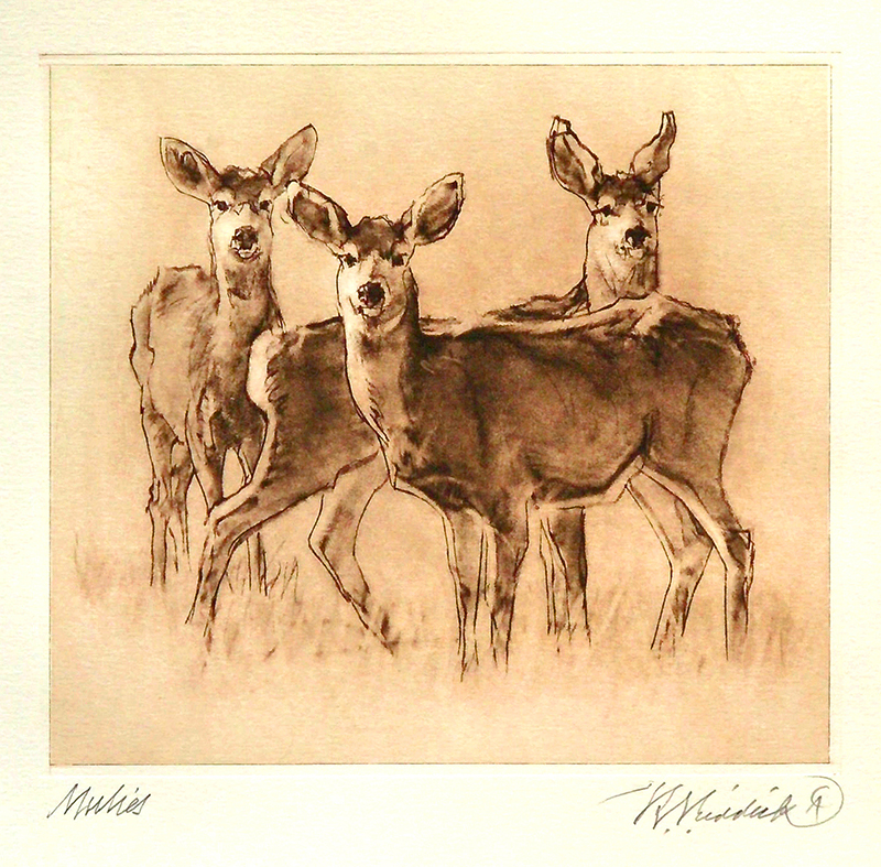 “After rekindling my love of printmaking since the process became a safer eco-friendly, less hazardous studio experience, I ventured into creating 15 Western etchings. This small, limited edition, handmade, hand pulled intaglio etching, ‘Mulies’ pictures the delicate and poetic character of these wonderful deer.”