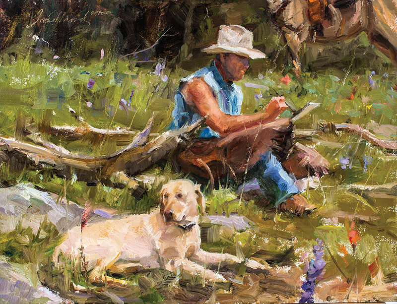 “Susan and I arranged a horse pack trip into the mountains around Big Sky, Montana. The outfitter who led us to some outrageously beautiful views decided to pull out a watercolor pad and some paints and have a go at plein air himself. I got off a quick shot of him, his dog, and horse while he painted the high meadow wildflowers.”