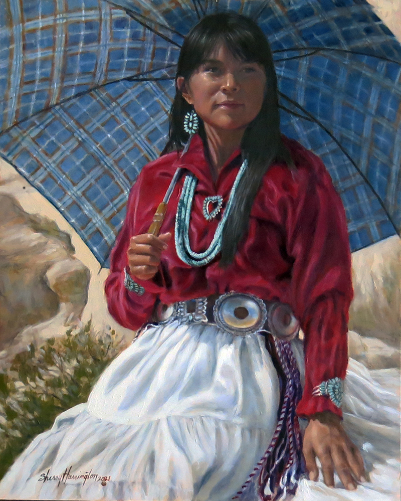 Sherry Harrington has a strong affection for Texas, where she was born, raised, and continues to live. Vast fields of Texas Bluebonnets or cowboys herding cattle, however, are not the subjects of her paintings. She much prefers to fill her canvases with portraits of beautiful Native American women and children.