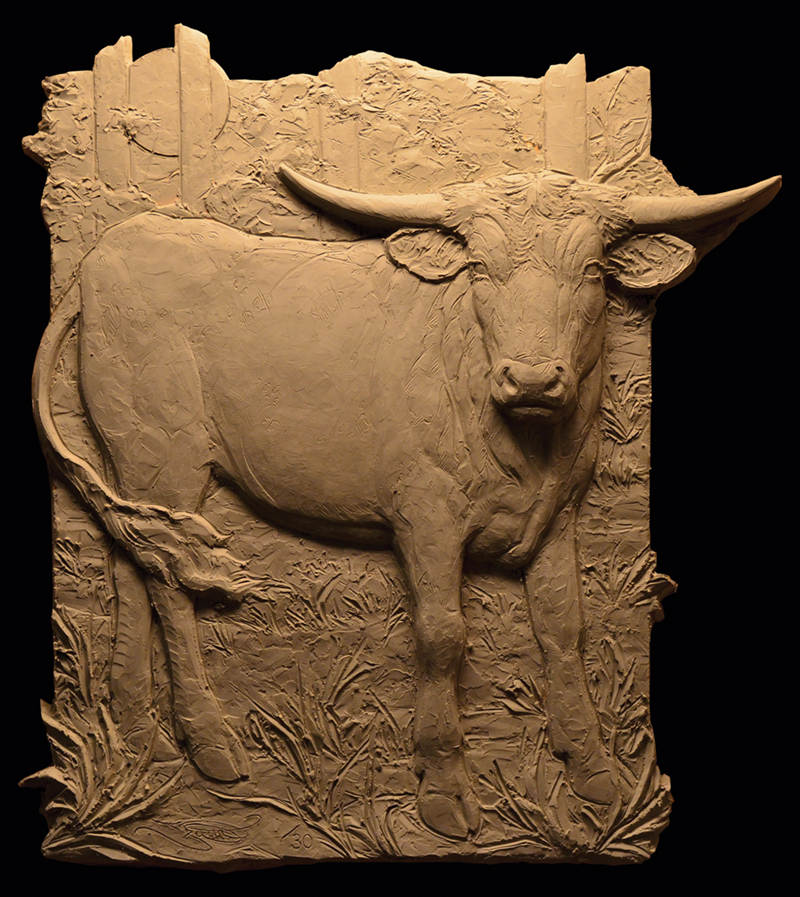 “The stoical nature of cattle has always fascinated me. I grew up around them on our family farm and came to appreciate their power, tempers, and remarkable gentleness. How often I have seen a cow or bull startled from its quiet routine into a moment of sudden watchfulness. Despite domestication, this moment underscores something more elemental—something left of what is wild and wonderful in these roaming creatures. That, then, is the root of what I sought to convey in this sculpture—a pause of poignant eye contact, stillness, and assessment.”