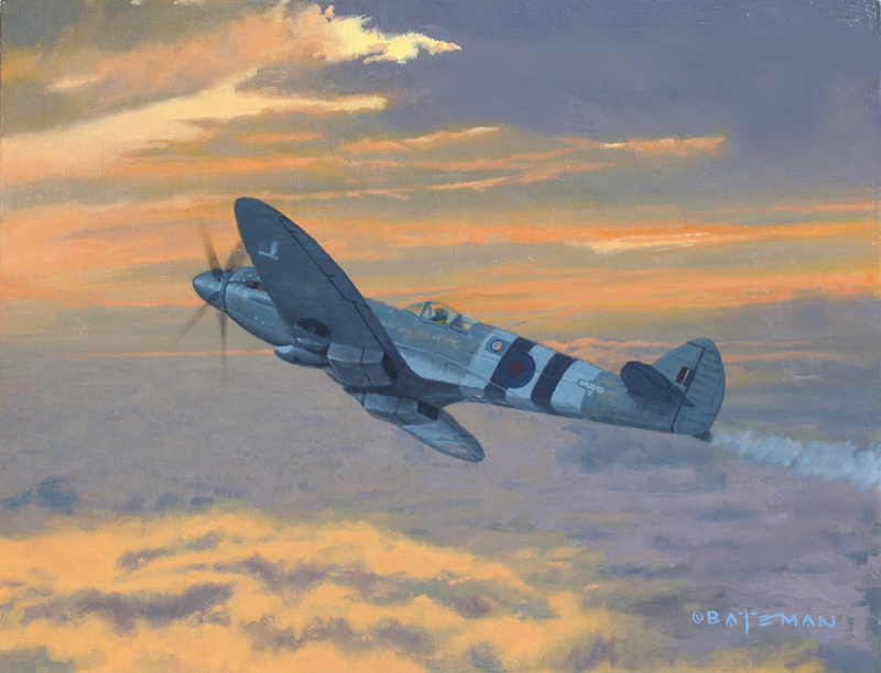 “The intelligence battle during WWII was imperative to victory from the allied side, and the aerial photo reconnaissance campaign against Hitler’s Germany was ever-changing with the introduction of new enemy technology along with enemy air bases scattered among the Netherlands launching Germany’s V-1 and V-2 rockets against a tenacious Britain. These photo recon missions were lonely, cold, and dangerous as the pilots usually flew unarmed, but the latest version of the famous Supermarine Spitfire was up to the task. In this painting I show a lone Spitfire MkXIV on a photo reconnaissance mission banking high above the North Sea at dawn as he heads out towards the intended target over Northern Germany. It will be a long tedious flight from which he hopefully will return with vital information from his photographs over enemy territory.”