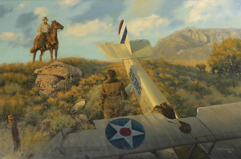 “This painting was my very first introduction into the western art world as I was invited to join a large art show in Dallas, Texas, where I knew I had to pursue this genre. I have always been fascinated with the early days of aviation, in particular with the beginning of the U.S. Air Mail flights across the country. These were long hops from station to station, flying in all types of weather while trying to reach their final destinations out West. This painting depicts an airmail pilot who has crash landed on a rancher’s field somewhere in southern Wyoming. He has either run out of gas or has had a mechanical failure and has had to put the Curtiss Jenny down quickly. With a full load, he has sheared off his landing gear, which caused his wing to dip and caused major damage to the aircraft. The rancher, who heard the commotion, climbs atop the bluff to find the pilot who asks him for directions to the nearest town so he can contact his boss. The rancher finds it all somewhat comical—but, for the pilot, there will be no mail delivery today!”