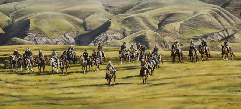 “To celebrate the millennium, the Calgary Stampede decided to bring its horses from its ranch outside of Calgary to the annual July Stampede the old fashioned way – overland with cowboys as opposed to truck and trailers. This epic event took about five days. Because it was so popular, they did it again five years later in 2005. This painting depicts that event.”