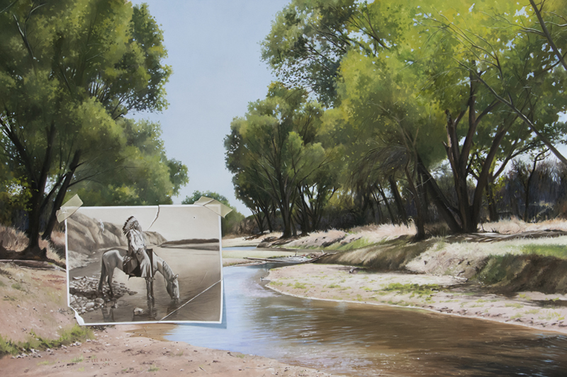 “I added a trompe l’oeil painting of an Edward Curtis photograph from 1926 to my landscape to create this homage to the American Indian. Symbolically, I am returning him to the land that he once occupied. It is part of a series that I call Spirits of the American West. Each title is from a Native American saying.”