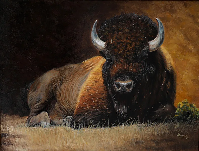 Arkansas oil painter Brenda Morgan’s artistic life currently is a tale of two buffalo—or maybe three. “It’s a long, sad story,” she says with a sigh. “The painting I’m working on is actually a replacement for the Woolaroc/Women Artists of the West Invitational Exhibition in May. I had two buffalo that were going to be in it but now I’m basically repainting one of them, painting the same painting. I varnished it, the same way I varnish all my paintings; I’ve used the same varnish for years. I don’t know what happened.”