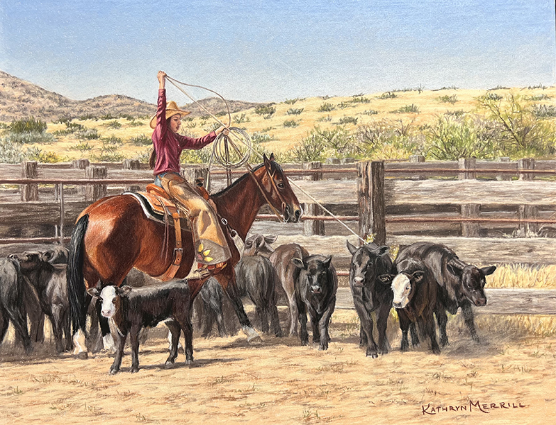 Kathryn Merrill has a lot going on right now, in both her life and her art. The accomplished Oklahoma artist, who brings ranch scenes to vivid life with colored pencils and oil paints, is in a particularly vivid period of her own existence. During the past year, she married Sid,