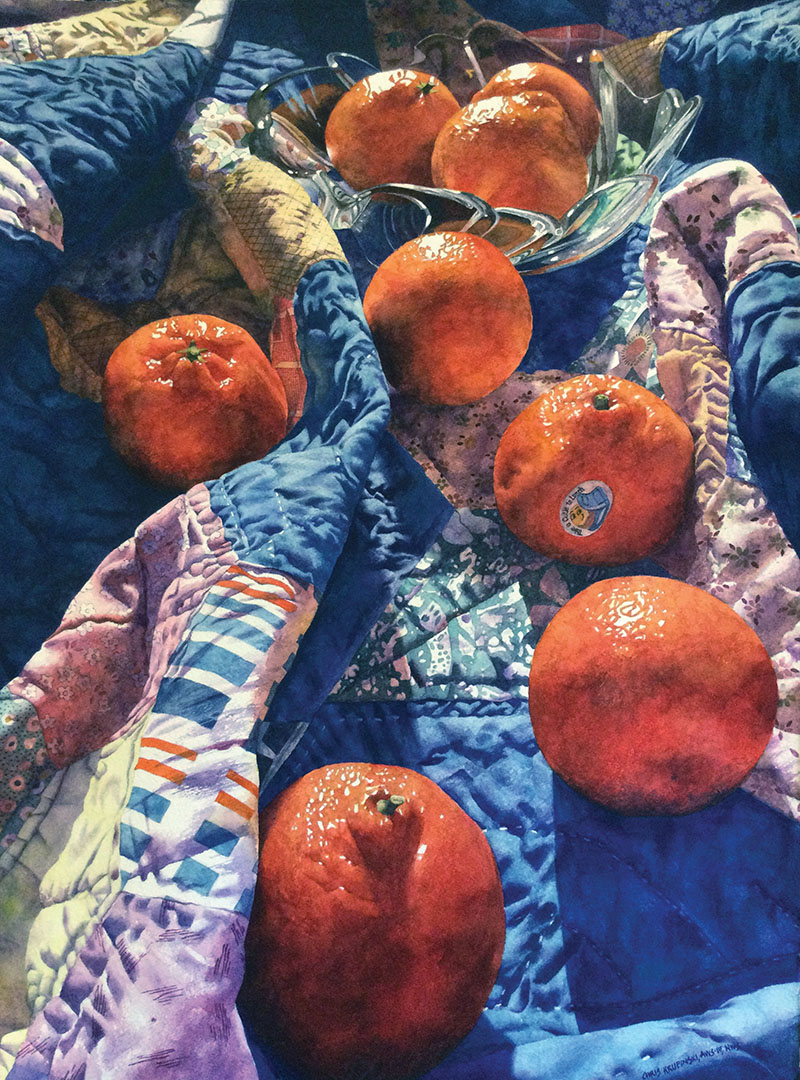 Fruit, fabric, and flexibility are three key elements in the process watercolorist Chris Krupinski uses as she creates award-winning paintings in the studio at her home in Cincinnati, Ohio. Fruits—everything from Chinese lantern plants and clementines to grapes and pears—are the focal points of her vibrantly colored paintings. Fabric—in the