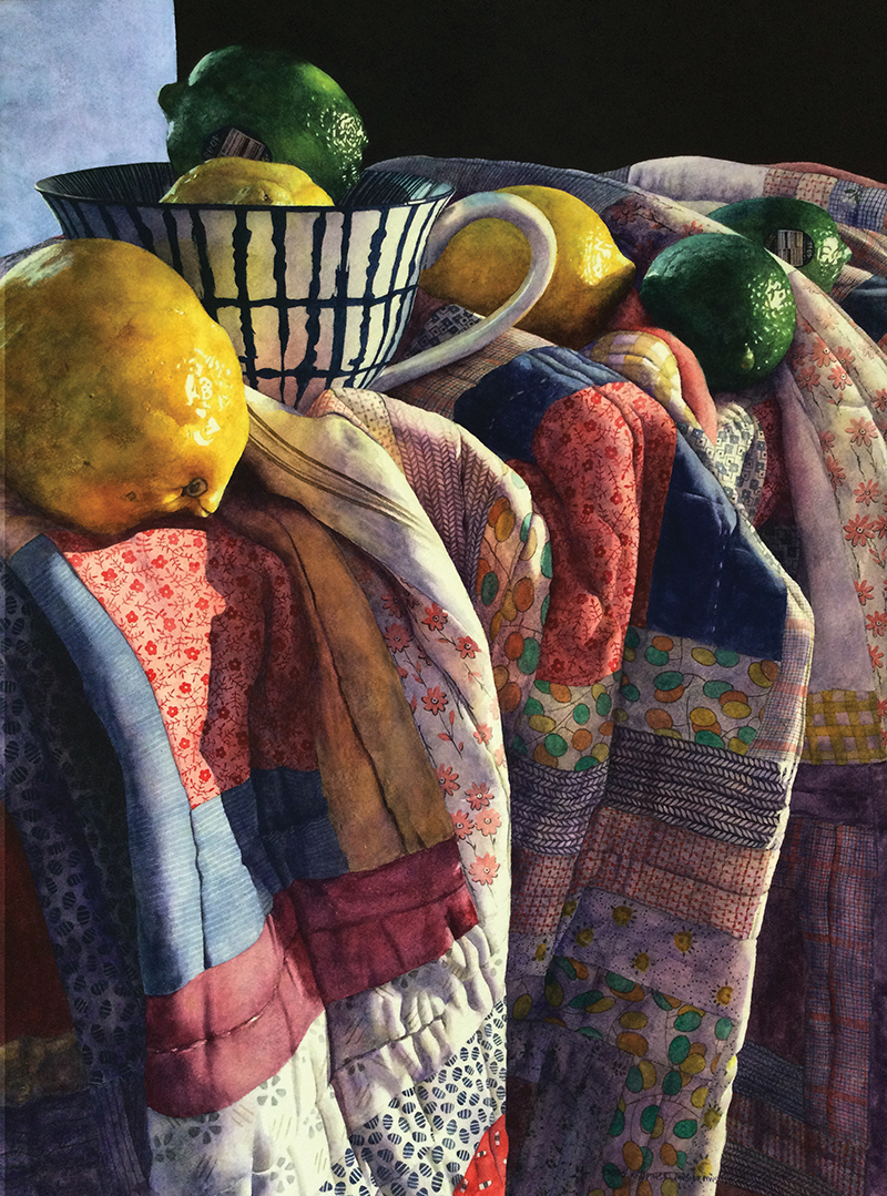 Fruit, fabric, and flexibility are three key elements in the process watercolorist Chris Krupinski uses as she creates award-winning paintings in the studio at her home in Cincinnati, Ohio. Fruits—everything from Chinese lantern plants and clementines to grapes and pears—are the focal points of her vibrantly colored paintings. Fabric—in the form of quilts—add interesting shapes and shadows, as well as texture that differs from other items in her compositions.