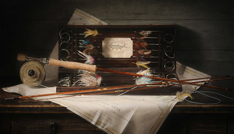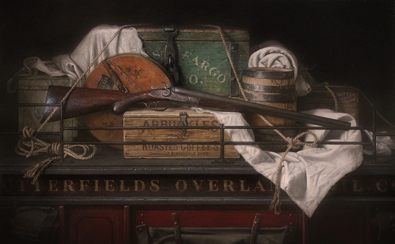 Earlier this summer, Polzin was hard at work in his studio, preparing paintings for a show he’ll have in September at Legacy Gallery in Santa Fe, New Mexico. The painting resting on his easel is a still life featuring a straw sombrero, a sarape, and a Winchester rifle.