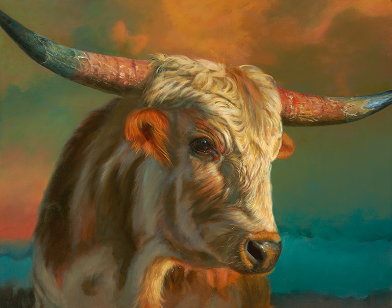 Elliott’s studio overlooks the Que Dice Ranch with 10,000 open acres of hills, buttes, and desert plants. Cattle often wander through the vista, so it’s not surprising that Elliott has made them her subject matter ever since she pivoted away from graphic design, copywriting, and illustration and into a full-time career as a fine artist. She did so in 2006, the same year she and her husband bought the property in Texas on which her studio now sits.