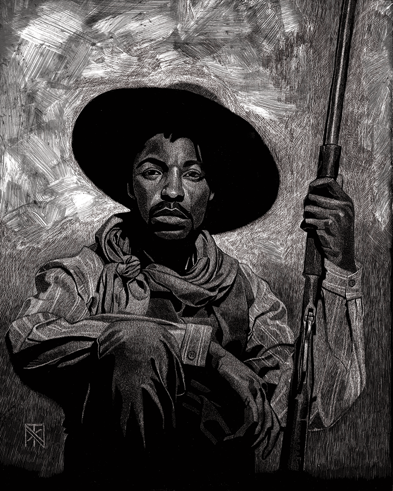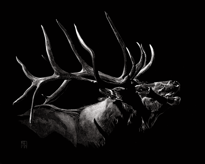 Tucker discovered scratchboard art when he was 10 and fell in love with the process of carving into an inked, black surface to reveal the white below the surface. His parents encouraged him, but he found it difficult to find anyone who could help him learn the technique he needed. “All the art classes as a kid and college courses never taught scratchboard,” he says. “I just studied on my own to try to pick up the skill set.”