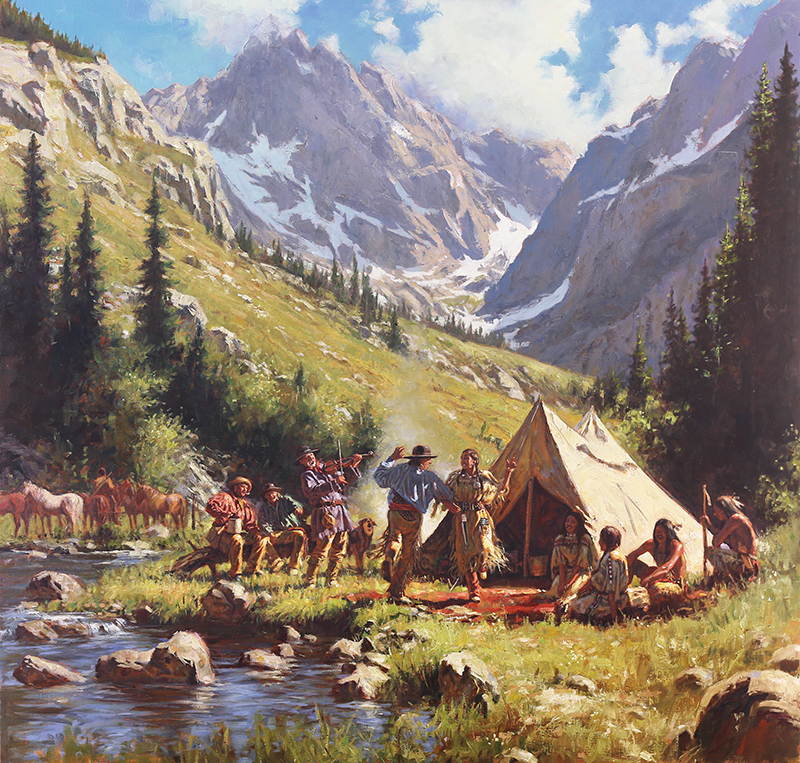 Some days, Don Oelze’s studio, tucked into a ponderosa forest under a mound of artistic boulders, resembles a movie studio as much as a painting studio. “I have a couple of really big photo shoots at my house every year,” Oelze says, adding that other artists join him for those shoots, which include models in authentic costumes and horses and a wagon outside on a hill.