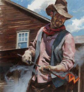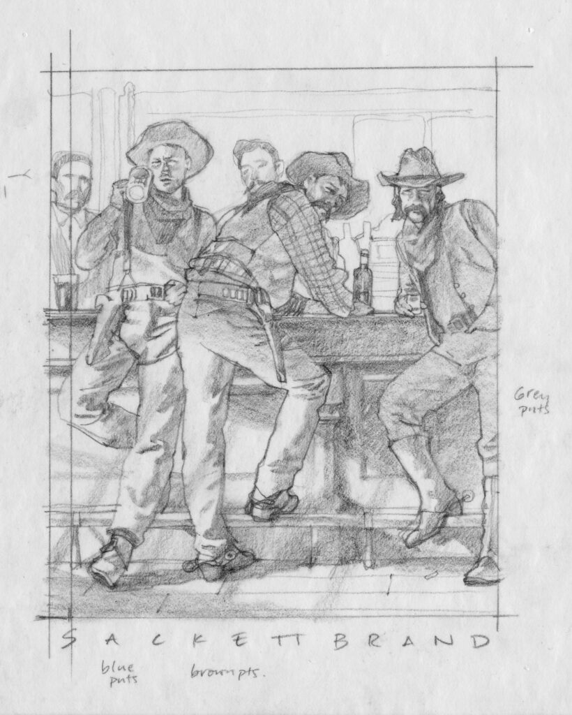 The show features 46 pieces, including original sketches and paintings that range from $40 to $6,000. All but 17 of the pieces are for sale; those 17 belong to the L’Amour family. The show opened May 3 with an artist demo by Manchess and other artists, plus a live figure drawing class and a lunch. Approximately 350 people attended the opening.