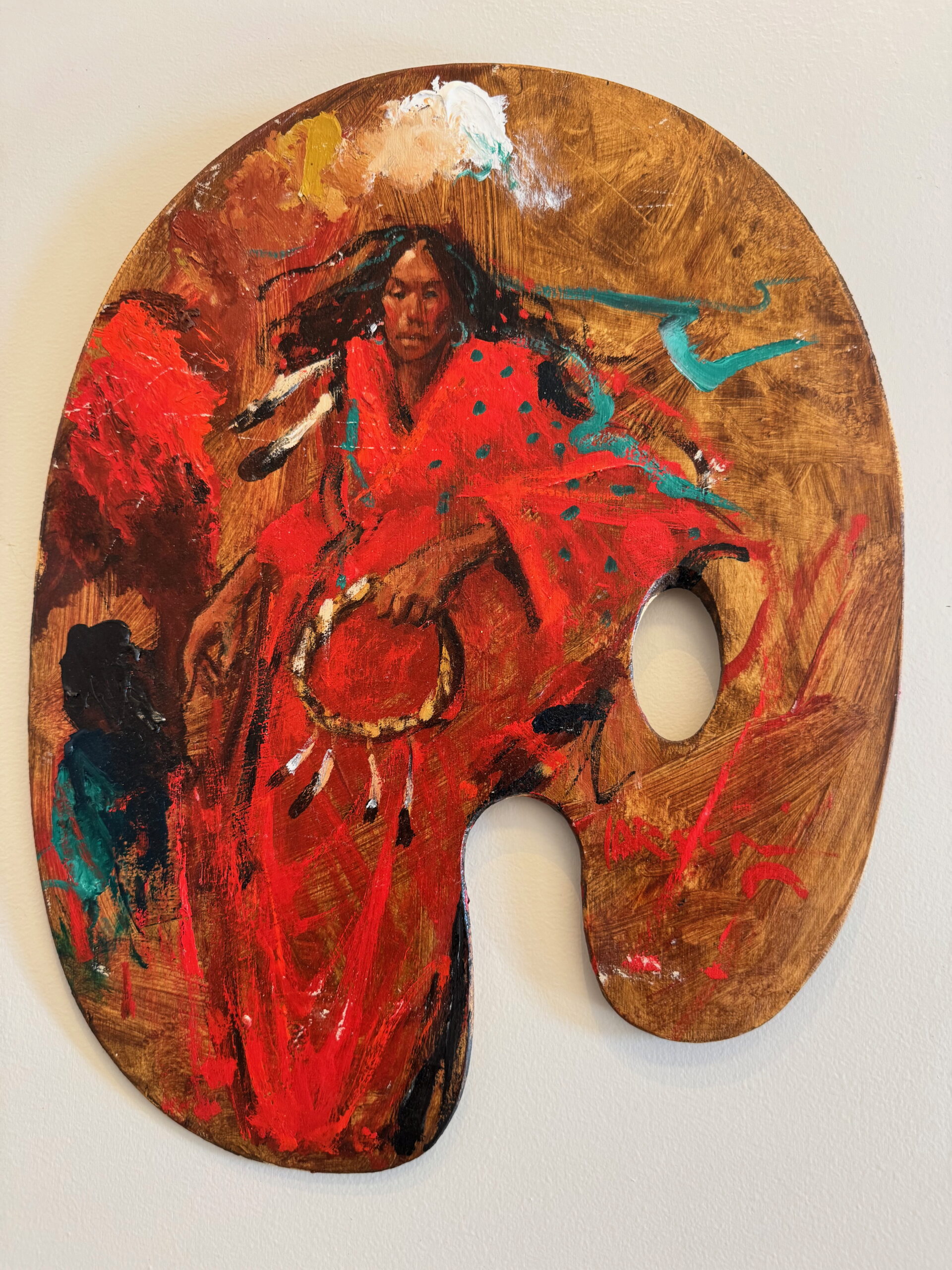That collection is the product of an art lover who also thought outside the box—or the frame, if you will. While hosting artist demonstrations, Pitzer would ask participating artists if they would leave their palettes with him. Not only did they leave their palettes, many of them did paintings on those palettes before giving them to Pitzer.